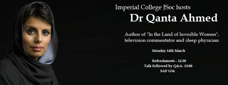 Imperial College JSoc is delighted to host Dr Qanta Ahmed - author, television and radio commentator, and sleep physician, who will be speaking about her experiences teaching medicine in Saudi Arabia...