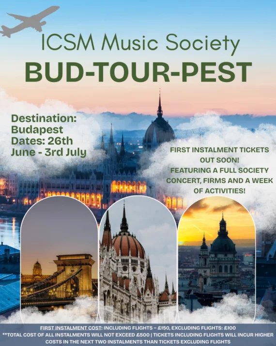 Tickets for BudTourPest!! Music’s biennual tour 2026 will be to BUDAPEST from 26th June to 3rd July! We are offering two types of ticket: one with flights included, one without. First instalment ticket price with flights = £150 First instalment ticket price without flights = £100 Disclaimer: If you choose the tickets with flights included, the next two instalments will be more expensive than if you choose the flight excluded ticket.