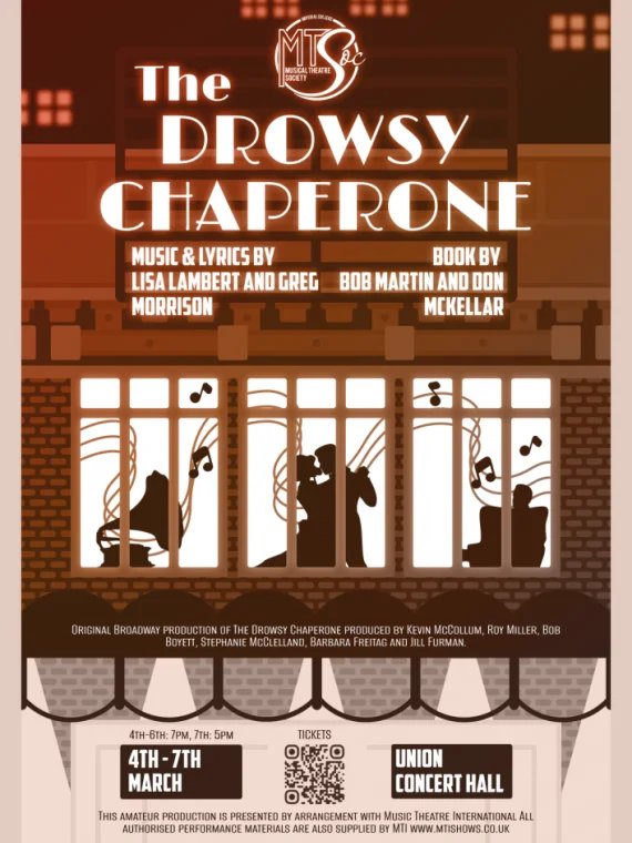 Student/General tickets for The Drowsy Chaperone - MTSoc's biggest, most meta production of the year! This comedy within a musical follows a man listening to his favourite musical, The Drowsy Chaperone, on a record - yes a record! Come along and experience the musical come to life in his living room filled with hijinks, miscommunication and nostalgia!